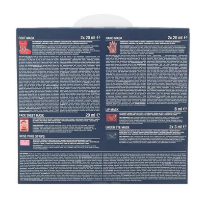 Desde una mascarilla facial hasta una mascarilla para las manos y 2 calcetines con mascarilla para los pies, y desde una mascarilla para los labios hasta 2 mascarillas para debajo de los ojos y 2 tiras para los poros de la nariz.